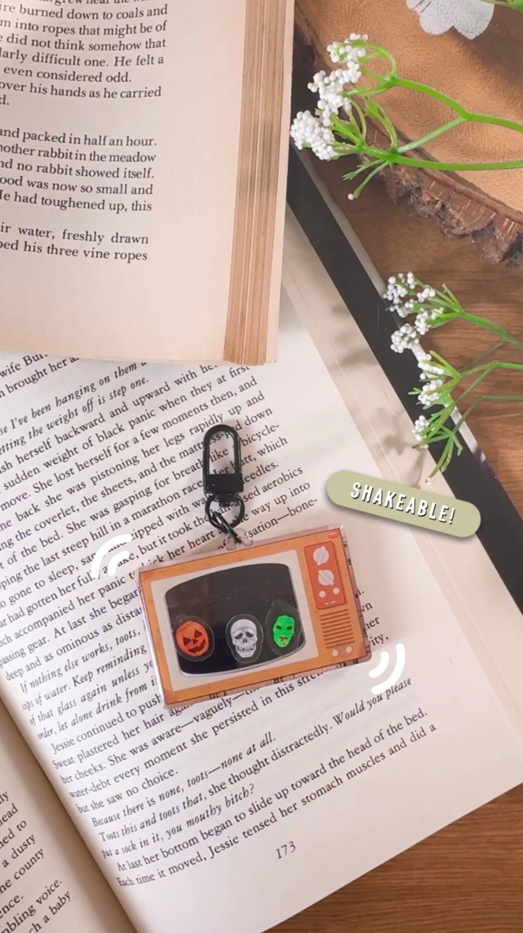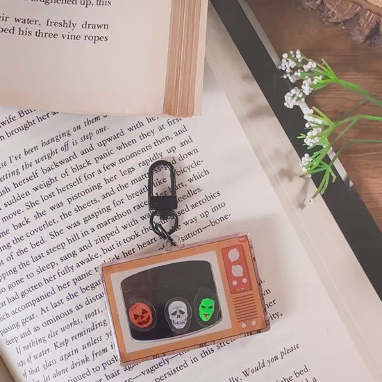This acrylic keychain is double-sided with 3 Silver Shamrock masks that shake around inside. Shaker charms are are only visible from one side of the keychain. Black clasp is included, however it can be removed so you can customize your own keychain when you receive it.